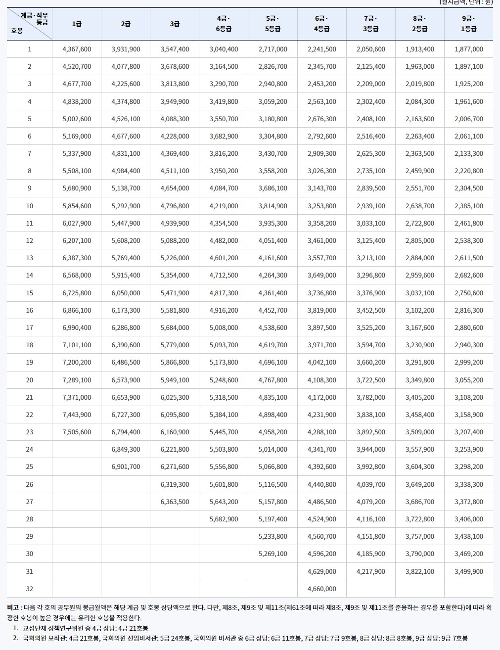 - 저연차 공무원 추가 인상: 9급 1호봉의 경우 6% 인상되는 등 저직급·저연차 공무원의 봉급 인상 폭이 더욱 큽니다. 9급 1호봉 기준 월 251만원 수준으로 인상되었습니다.