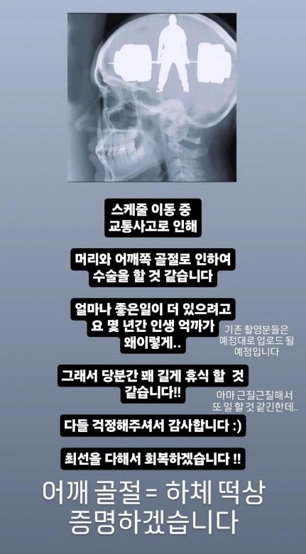 아니, 이게 무슨 일입니까. 김계란 님이 교통사고를 당했다 합니다. 인스타 스토리 보니까 머리랑 어깨 쪽 골절이라 수술까지 해야 한다 합니다. 와, 진짜 큰일 날 뻔했습니다.
