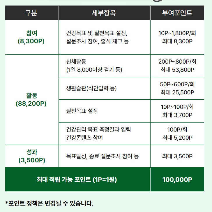 - 푸짐한 포인트 혜택: 하루 8,000보 걷기 등 건강 활동을 통해 최대 10만 포인트까지 적립 가능합니다.