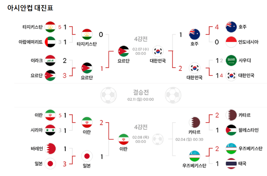 클린스만 감독이 이끄는 대한민국 대표팀이 아시안컵 8강전에서 극적인 결승골로 호주를 꺾고 4강에 진출하게 되었습니다. 아시안컵 4강의 일정과 대진표가 궁금하실 텐데요. 4강전 최신 대진표를 가져왔습니다.